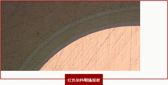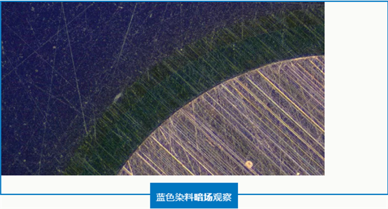 本文以紅色染料、藍色染料為例,將其分別添加入 Epokwick FC 環氧樹脂,研磨拋光后在顯微鏡下觀察樹脂與漆包線的對比。